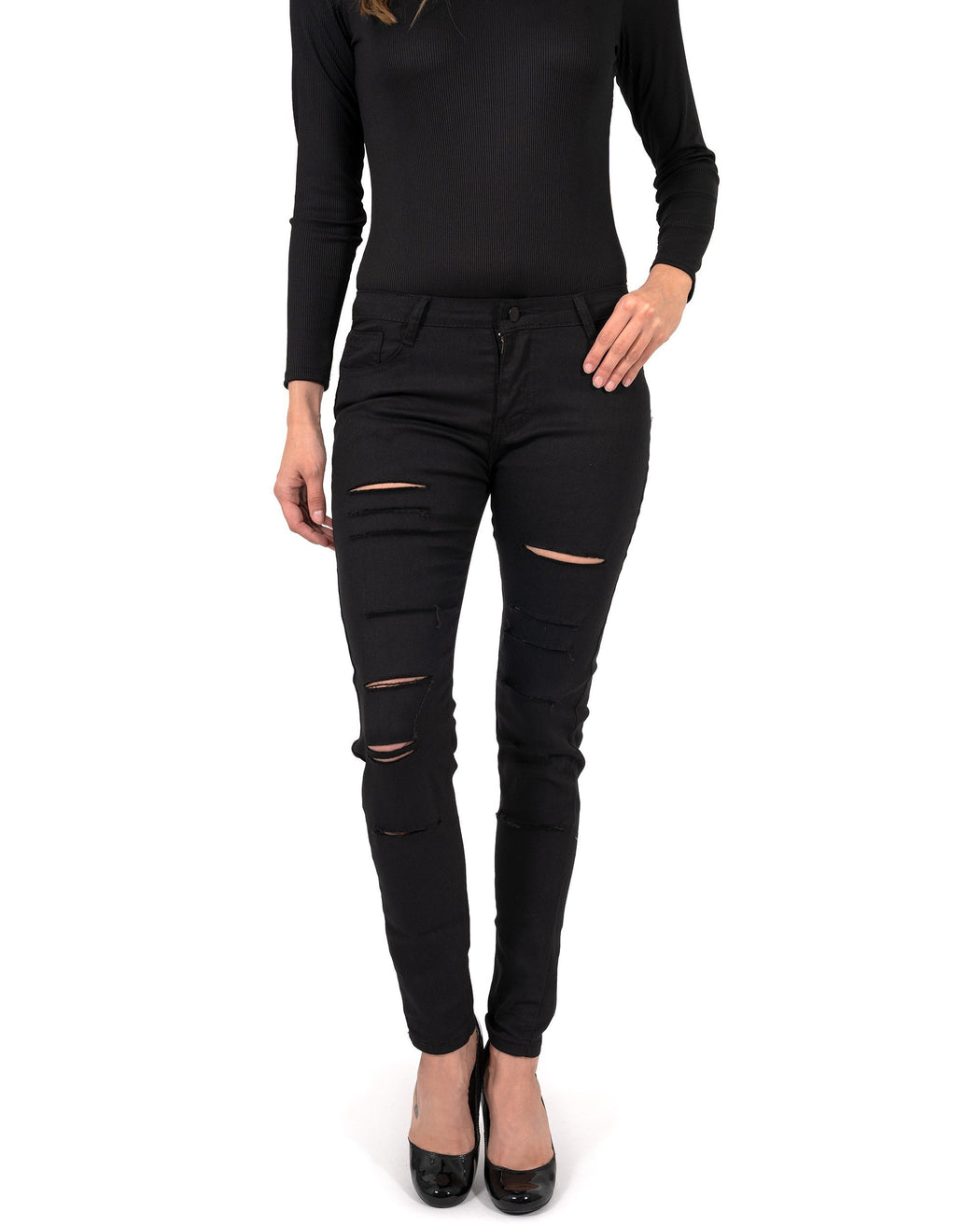 Our Clifton Ripped High Waisted Skinny Jeans features a black denim fabric, skinny stretch fit, and slit distressing detailing throughout.