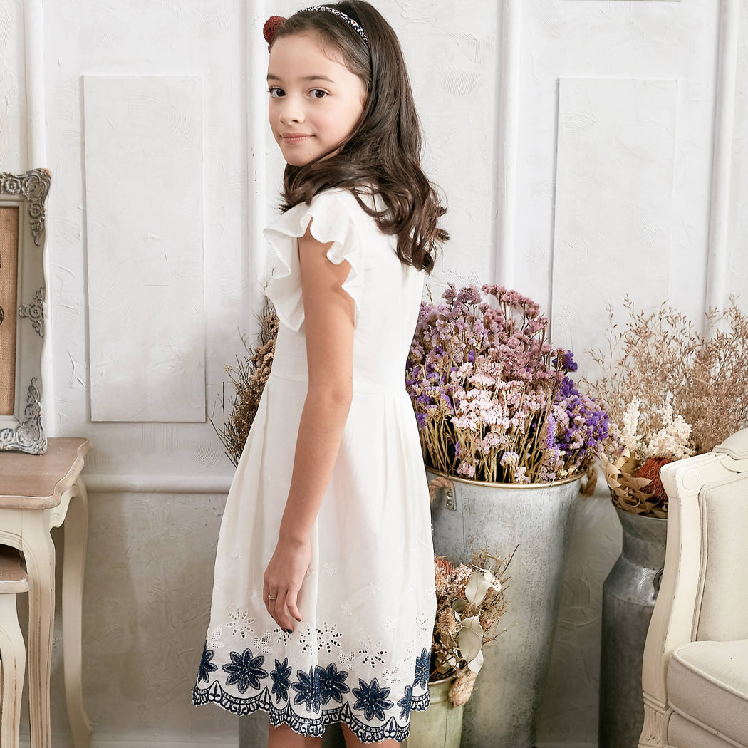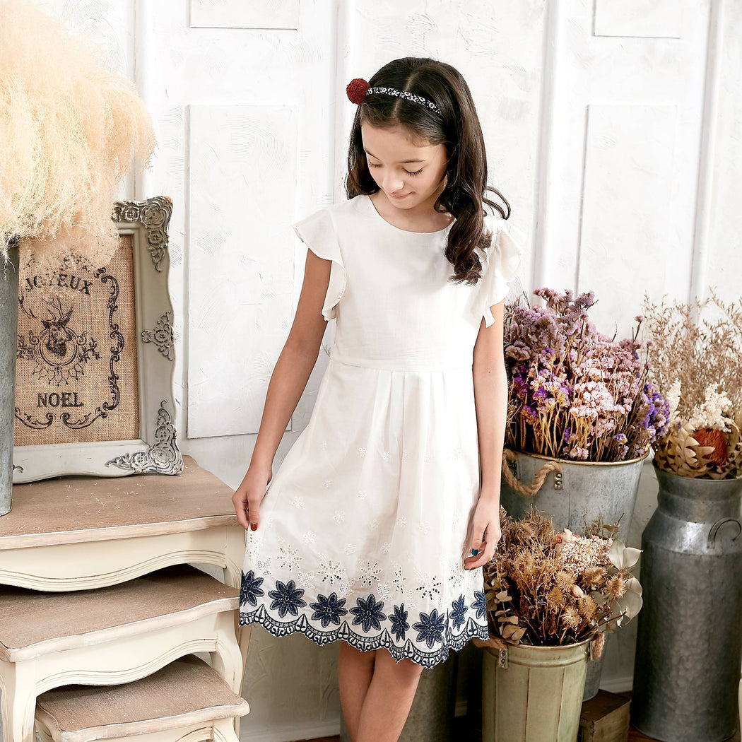 Warm days call for easy dresses like this. Made of soft woven cotton through and through, it’s dotted with embroidered blue flowers and gentle scallops along the hem.