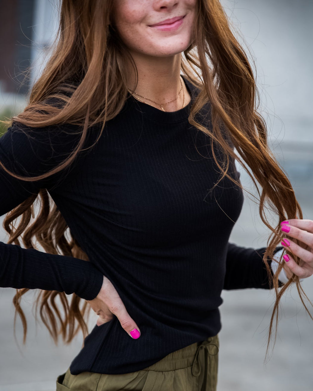This ribbed long-sleeve tee is perfect for layering! Wear it under your favorite graphic tee or Jumpsuit to transition into cooler weather.