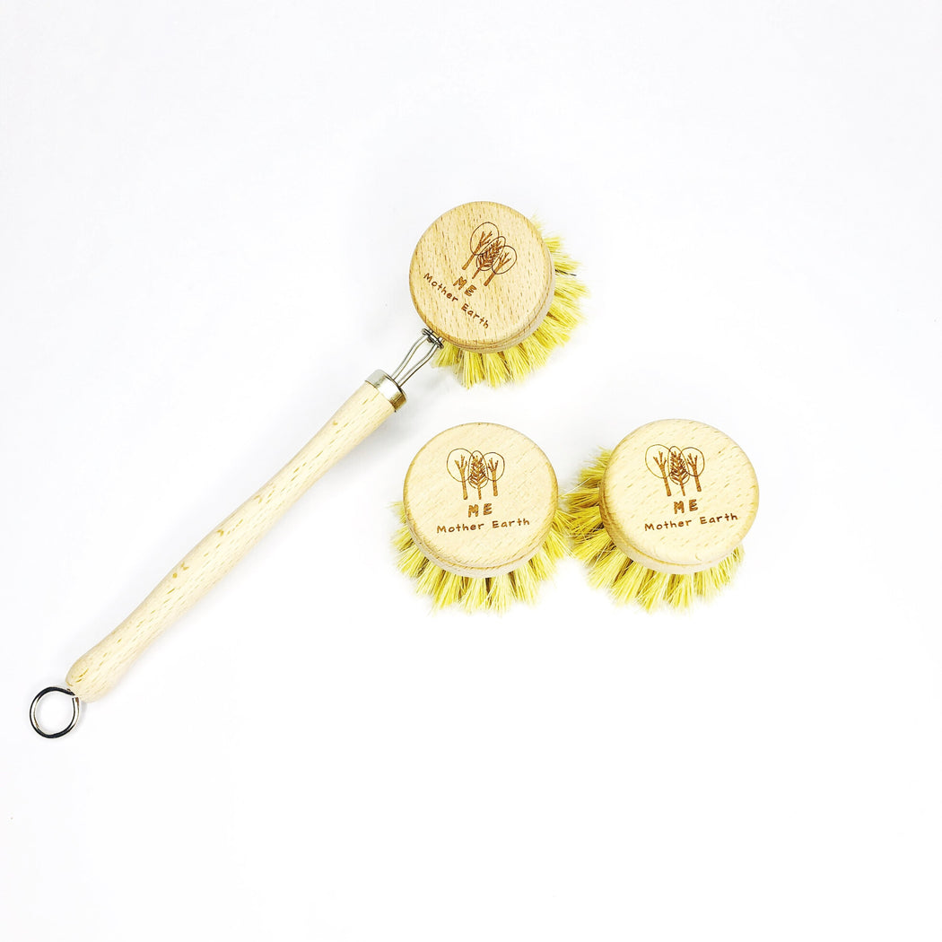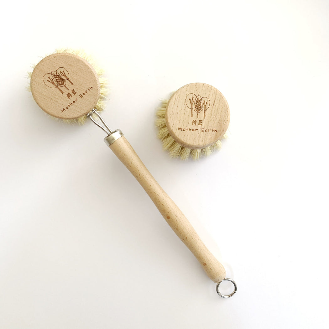 The head is removable and replaceable. Bundle with refill heads to save! Our kitchen brush has a beechwood handle with sisal fiber (agave plant) bristles. Minimally fastened together with a metal wire & metal loop to hang to dry.