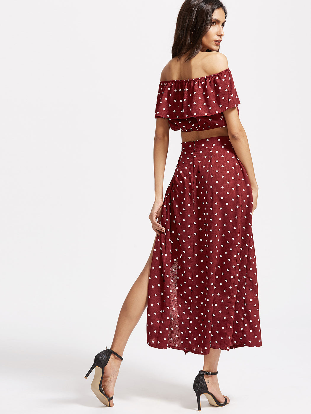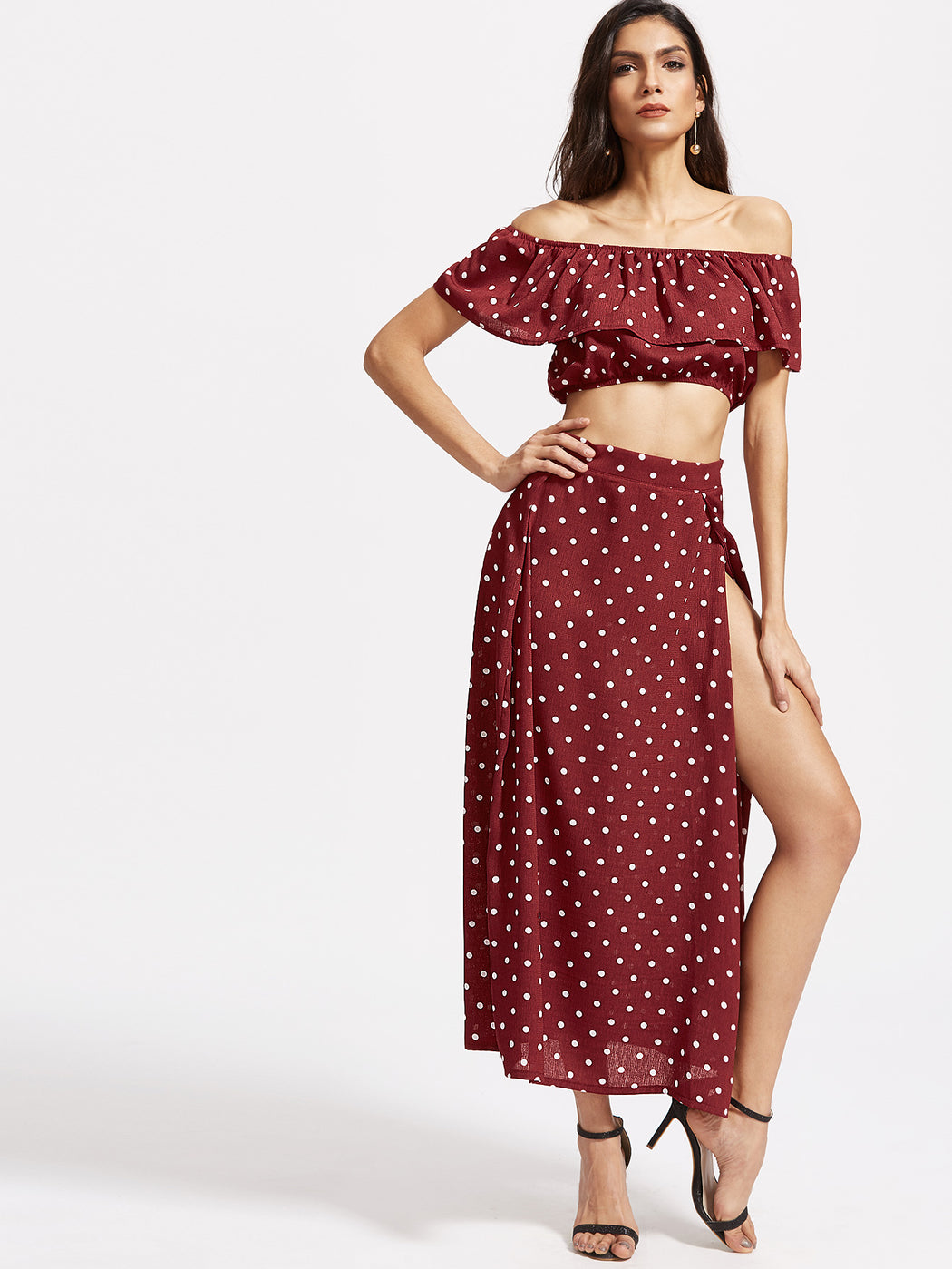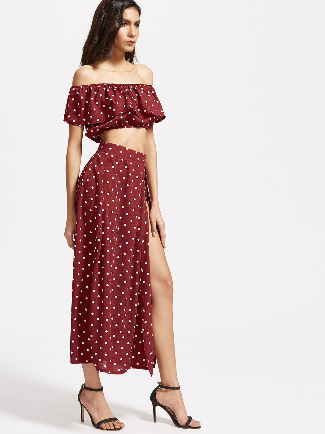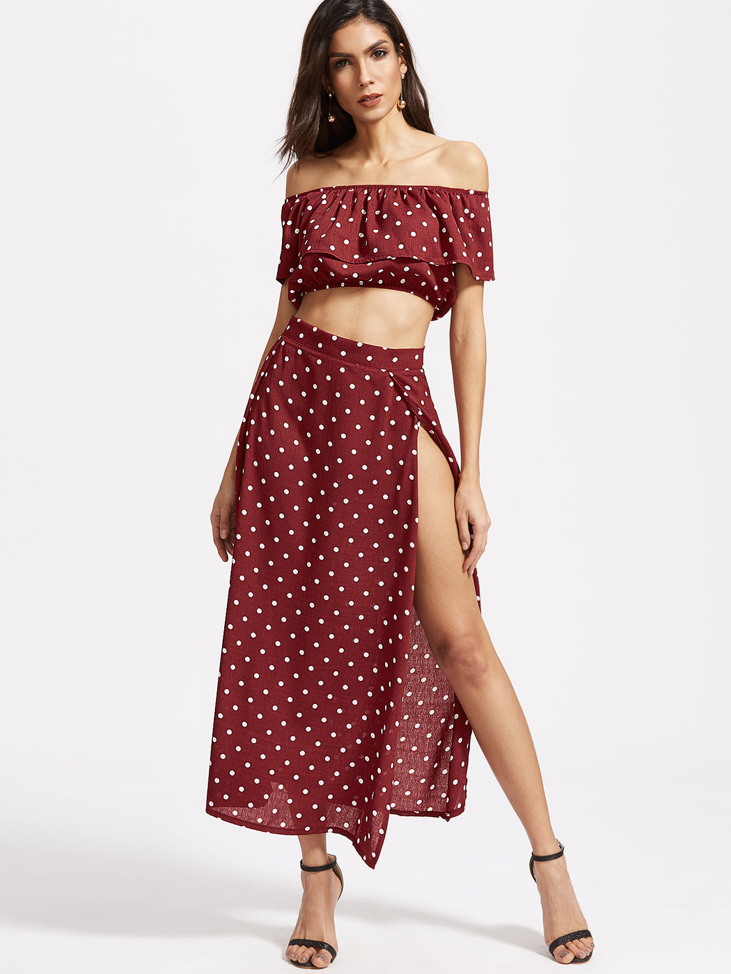 Polka Dot Ruffle Crop Top With Split Skirt