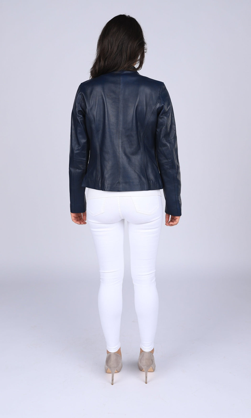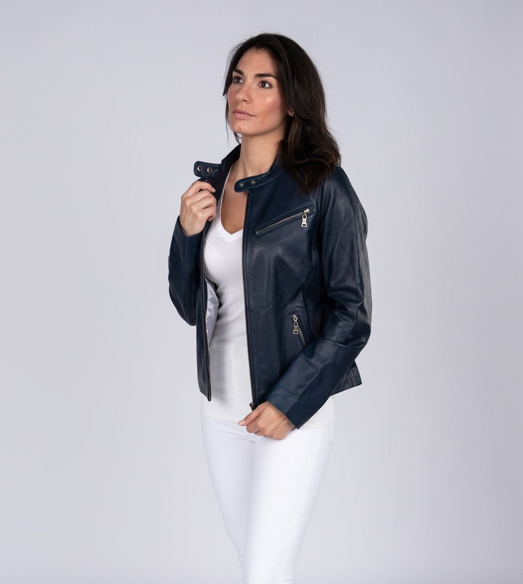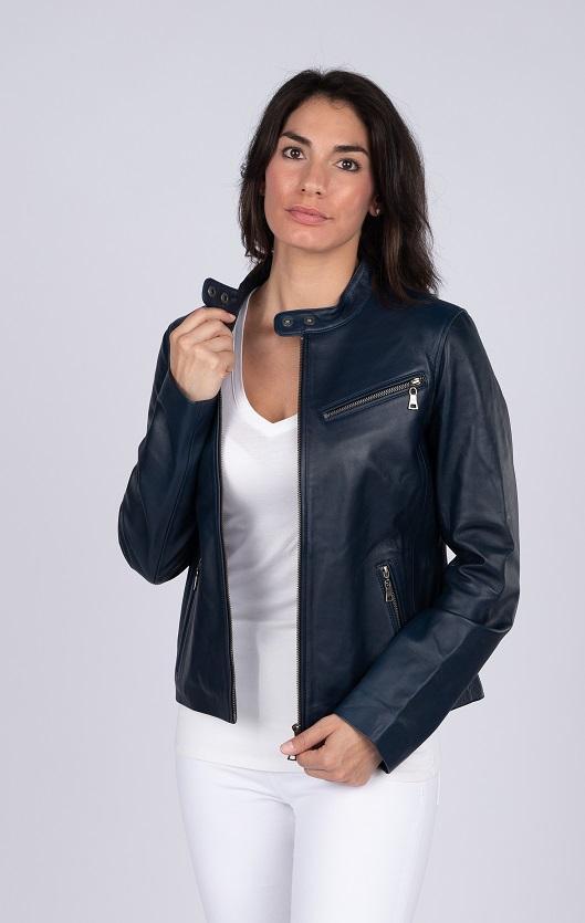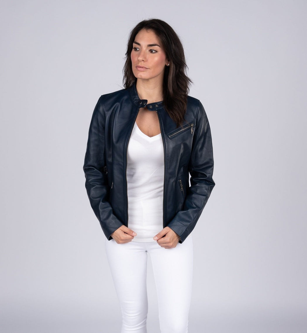 Womens Zip Up Leather Jacket. Full Aniline Lambskin Leather. Shell Polyester White Lining for Body & Sleeves. Zip up midsection. Supple Leather with Wax Finish for excellent hand feel. Metallic Zippers and Buttons.